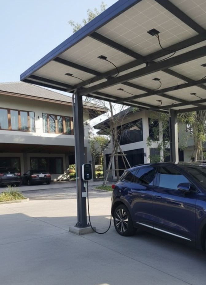 ผลงานของเรา: โรงจอดรถโซล่าร์เซลล์ AC พร้อม EV Charger